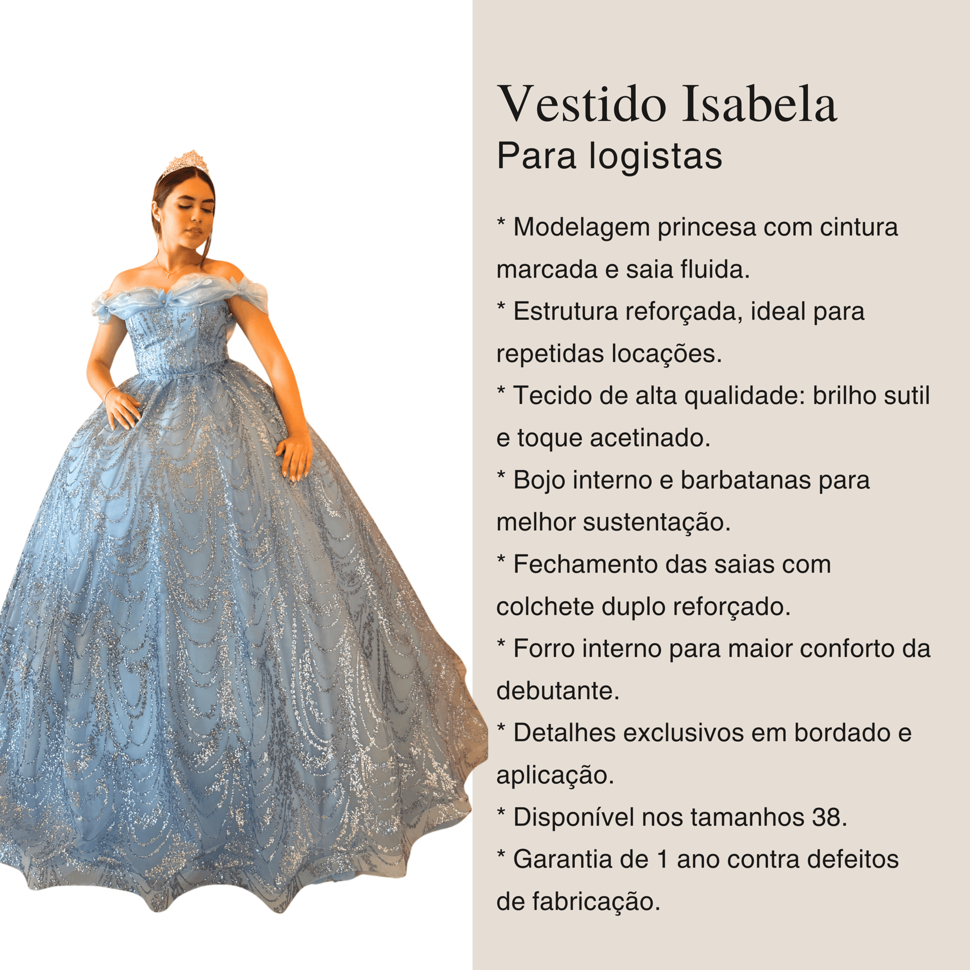 • Forro interno para maior conforto da debutante.