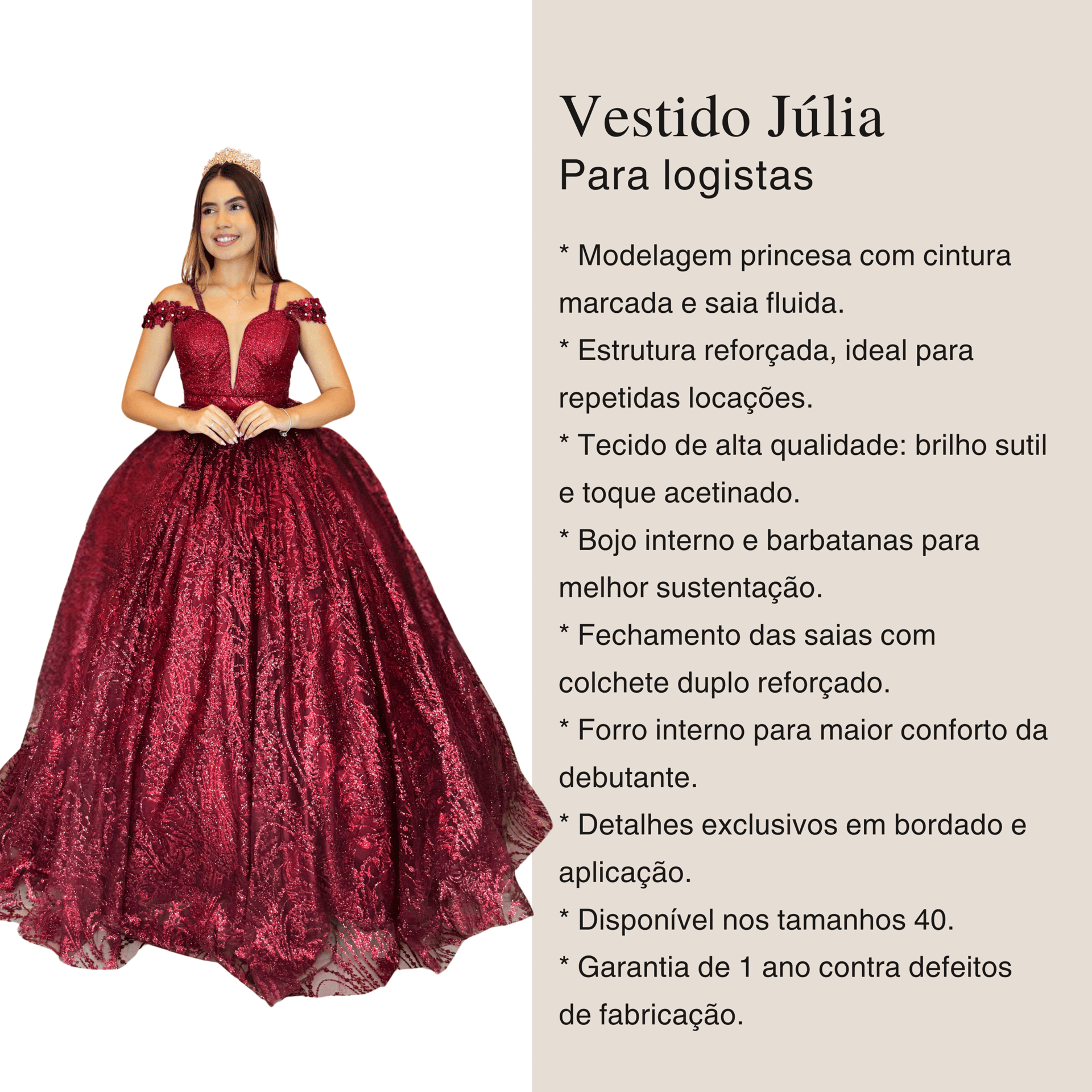 • Forro interno para maior conforto da debutante.