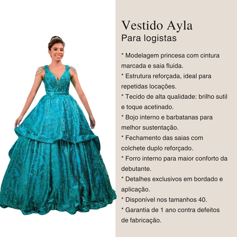 Encante suas clientes com o vestido Ayla, uma peça criada para brilhar em grandes momentos. Ideal para debutantes que buscam um visual marcante, moderno e ao mesmo tempo delicado, nossa referência Ayla combina sofisticação, caimento impecável e detalhes que fazem toda a diferença.